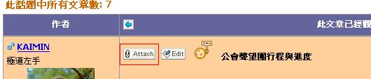論壇夾檔教學小弟小小整理了在論壇上如何夾檔的簡易教學 請笑納...步驟一、如下圖一,按下你已經完成發表而且想夾檔的文章上【Attach】按鈕,沒看到表示沒有權限,或者是站長笨蛋設定錯誤(請回報小惡魔)。 步驟二、如下圖二,會出現下一個畫面,按下【瀏覽】選擇您電腦上想上傳的檔案,在『附加檔案描述』說明一下,最後按下【附加檔案】即可完成喔!!! 其他注意事項請參考 本站公告 內有詳細說明 ![]() ---------------------------------------- ---------------------------------------- ---------------------------------------- 支持小惡魔 BTC : 19tn3RnCuwZVukXAwyhDWZD4uBgUZoGJPx LTC : LTFa17pSvvoe3aU5jbmfcmEpo1xuGa9XeA 知識跟八卦一樣,越多人知道越有價值;知識最好的備份方法,散播! 藍色小惡魔(林永傑): 臉書 ---------------------------------------- [編輯文章 1 次, 最後修改: jieh 於 2006/8/9 下午 02:14:06] |