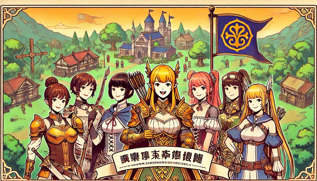 給我一張符合臉書貼文理想尺寸比例的圖片(但是不要出現facebook的元素在裡面),我的公會名稱是「SRGT」請設計旗幟時使用「SRGT」的文字和logo設計。圖片風格為台灣復古漫畫風,要表現出線上角色扮演遊戲各種職業的人物,例如要有戰士、法師、牧師、弓箭手、劍士、斧頭手、聖騎士...等共七位都要上場,角色均為女性設計並且弓箭手要在C位,背景是在一個和樂融融氛圍且綠意盎然的公會島嶼上拍攝的官方宣傳照!