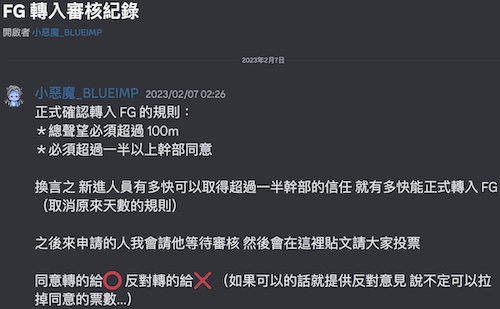 | 如何從 BLUEDEER 轉入 Formosa Guiders:別讓三姑六婆不高興!2023-12-08 update:第四公會即將啟動,公告將於近日發布,由於會重新詳訂公會移民政策,所以整理時順便 review 轉入FG的規範,有感而發加上一段一直難以啟齒的說明,希望不需要多想的人別多想;但是必須多想的人應該要多想想:到底如何才配得起當 SRGT 的資深前輩!? 新人會先安排到稅率只有 5% 的 BLUEDEER 公會發育和瞭解公會規範 等一下你要注意看邀請的訊息公會名稱是否為「BLUEDEER」 千萬要看過再按同意 否則就要再過三天才能再進公會 請勿在戰鬥的狀況下 通知我送邀請給你 每一位尋找通關密語面試進來的成員 大部分都看過上述的通知文 沒看過的主要是在今年一月前 招募的人會因為資深或引薦的關係 給予 Formosa Guiders 或 BLUEDEER 的公會選擇 不過本月起 所有面試新進成員 無條件通通都安排邀請到 BLUEDEER 公會內先跟大家相處並且熟悉公會規範和文化 即使你的總聲望超過1b 而進入 Formosa Guiders 的規則就改為:審核制 FG 轉入審核記錄(此版僅在核心幹部專屬討論區內) 轉入 Formosa Guiders 總聲望的規定不變:100m 但是取消天數的限制 換言之 入會當天你能獲得大多數幹部的信任和認可 就能提出轉入 Formosa Guiders 的成功機會 而有投票權的幹部是 discord 內身份組為:三姑六婆的那群人... 投票沒什麼規則 我完全尊重每位幹部的想法和作法 可能會直接給你過半數同意 也可能進行激烈討論「審核期無限」期間每個申請人都會被持續觀察直到通過審核 一切的作業過程都不會被公布 讓幹部能安心真實表達出他的想法和觀察的意見 所以 我們也不會告訴你尚未通過的原因 可能你大部分會收到的官方消息是:還在審核中... 這是因為只要你沒有被踢除公會 就表示永遠享有讓自己改變成長為「更符合公會文化期待」的機會 一直到被大部分幹部認可 你就會收到通過審核的通知! 在此先表達我期待進入 Formosa Guiders 應該有的樣子 但是其他幹部不一定要認同我 他們可以是僅按照「Formosa Guiders 人數 < BLUEDEER 人數」就給予同意票 也可以完全反對以下我的想法 我的一票跟幹部們的每一票同等 幹部們彼此間可以互相遊說 但同樣要尊重互相不認同的理念多樣性 那我期待的 Formosa Guiders 成員應該是什麼樣子呢? 長遠來說 Formosa Guiders 不一定會比 BLUEDEER 擁有更好的條件 就眼前稅率來看就是擺明多 5% 我不希望也不會去製造 Formosa Guiders 有更好的條件 甚至我會規劃更多 BLUEDEER 的福利 為什麼?(稅率已於第三公會啟動時調整為聯盟一致 10%) 因為,我想找出 真正願意為公會著想、貢獻和服務的人,以及能夠具有站在群體高度思考的人 來和我一起發展公會,這是我會給你一票的唯一原因! 其他幹部不必要像我這麼正經 可以輕鬆點 可以現實點地給出你的一票 以平衡我的理想可能帶來的負面影響 so... 三姑六婆的人很多 如果你想轉入 Formosa Guiders 但又不能做到我期待的樣子 那就趕緊去討好其他三姑六婆們 來稀釋我的影響力囉~~ 制度是可以滾動的,想改變的話,就嘗試用你的智慧和理性,來取得我打從心底的認同,這樣制度就有機會被調整。因為你認為絕對好的想法,那也是你的認為;就如同你認為我的想法只有我認為好是一樣。但我確實都會考慮很多很多很多,才會決定執行,但也沒什麼完美的決定,因此就是要保持調整的彈性讓公會持續安穩地繼續成長! 好聚好散!日後好相見...我不會否定每個離開公會的人會發展得更好;相對的不認同公會的人,建議你不要豪賭我們公會瓦解,而試圖做盡破壞的能事,這樣或許哪天我們公會突然發展出被你認可的狀態時,大家才能再度並肩作戰,不是嗎? <申請方式>找到一位會長以外的幹部幫你在核心幹部審核區內提出申請即可 最後來補充一件偶爾會被問到的事情,似乎他們對 Formosa Guiders 內的人有些疑惑,這些就是會長您說的:真正願意為公會著想、貢獻和服務的人,以及能夠具有站在群體高度思考的人嗎? 從我第一次被問到這問題至今也有數個月之久,這期間陸續也會有人來提出類似的疑惑,我都會趕緊地相約到語音來跟他們解釋,畢竟這對我和公會來說是個很嚴肅的事情。然而公開來說是有點傷人,但總是要說明清楚的,而那些覺得自己會對號入座的人,我誠心希望你們趕緊成為我期待的人,如果這樣不符合你個性的話,也要盡力抑制自己平常的言行,至少讓自己更配作為 Formosa Guiders 資深的要員,而不是那種老是讓我要出面糾正或因為你而必須展開安撫人心的操勞... 我這邊不說具體不當的行為,這些狀況只要我知道了,我就會儘速在 DC 內做出行動,只不過有些人不常看 DC,又或者如果不是嚴重到讓我暴怒,我大多不會點名訓導,因而導致兇手不自知,所以請受到影響的相關人等包涵,如果真的日後該員還是經常讓你受到不舒服的感覺,隨時私訊讓我知道,我絕不允許劣幣逐良幣潛在我們公會! 我要說明的是,我們公會是從前公會 iYAYA - Formosa 開始發展,在前會長建議我們獨立創立公會時,我們就將當時所有的夥伴轉入 Formosa Guiders,這是第一批 FG 的成員;其後就以 Formosa Guiders 公會招募一段時間,大約到公會史記決定要走雙公會架構時,才開始將新手招募到 BD,而老玩家會考慮招募到 FG。所以初期對於想來我們公會的人,並沒有嚴格的篩選條件來分配到 FG,直到後來頒布本公告《別讓三姑六婆不高興!》的制