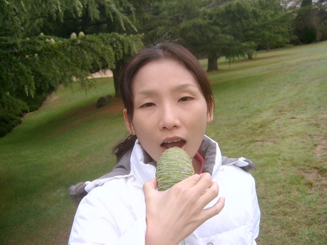 樹上長滿大大的松果 遠遠看還以為是被晶瑩剔透的露水包覆著 近拍才看清楚 原來是果樹的汁液 少見多怪... laughing 就拍張照留念