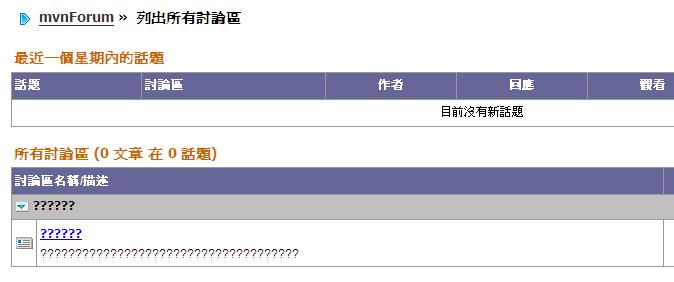 Re: 架站問題小弟是安裝install+server版本沒錯以上MySQL問題小弟都已經解決了。 但是小弟在配置版面時, 又遇到版面名稱會出現?????,如附圖。 是小弟在安裝mvnforum時遺漏掉什麼步驟嗎? ---------------------------------------- |
