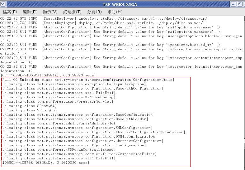 Re: 轉址 (Context Path) on JBoss這個地方小弟已經解了現在進度讓小弟有點confuse 附圖為小弟console端畫面 紅框的地方是小弟不知道為啥會出現的東西 ![]() ---------------------------------------- |