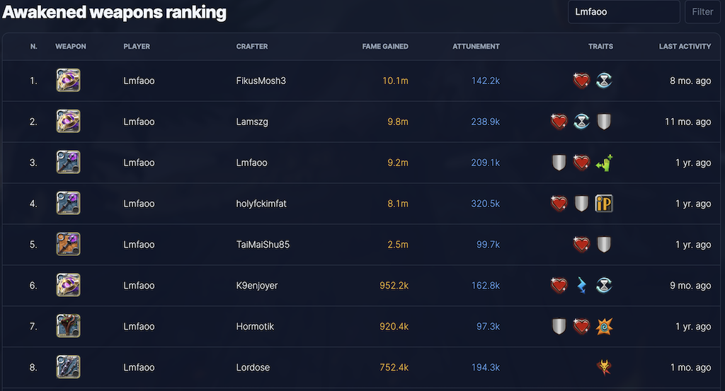 | albion 阿爾比恩輔助工具&入門攻略懶人包如果你在尋找 albion 國際服 中文公會 請參觀我們 [SRGT]Formosa Guiders 的 Discord 伺服器 https://discord.gg/yUqTT7yAyu 來玩玩這款遊戲:阿爾比恩 albion https://albiononline.com/?ref=YTB5XSL94Y 這是小惡魔的推薦連結 點這個連結過去後「先註冊帳號、先註冊帳號、先註冊帳號」 會使用 email 登入和認證 所以要用能收的信箱 如果被官方騙去先安裝遊戲 然後再從遊戲登入畫面去註冊的話 就不會被列入推薦 而且官方會用 超過時限 的藉口敷衍 不給予補償 這是沙盒遊戲(自由度極高的遊戲類型)可以殺來殺去、也可以當個奸商、大地主、漁夫、專家級礦工或專事採集的獵戶...等。所以開始深入 albion 的世界前,特別是你有親友一起玩這個遊戲,底下這段老人家碎念的經驗,務必聽進去才不會傷和氣~ Albion 玩法豐富多元,大多數內容設計都有它適用性的意義和情境,所以互相比較然後跟朋友互嘴吵架,沒意義的!! 每個玩法都是對的都是好的,就算只是個人喜好,甚至單純生性不愛冒險,一輩子都在皇家大陸刷藍洞,也是一種對個人而言有效益的玩法,你可以分享自己的玩法,但... 別去批評別人的玩法!別去批評別人的玩法!別去批評別人的玩法! 我這裡說的「別人」是指自己親友、公會夥伴、甚至是你臨時參與的野團隊友...都不應該輕易的去批評對方,特別是你自己搞不清楚自以為是在建議,但聽在別人耳裡就是在貶義! 但那些不認識而被我們擊殺的陌生人,當然就是我們的炫耀品啦!玩 PvP 遊戲不炫耀自己的擊殺紀錄,還有啥樂趣!? 基本攻略<官方教學文章> 《指南:天賦羅盤》 https://albiononline.com/news/guide-destiny-board <文字版攻略> 本公會刷聲望達人的文章《關於在 albion 選擇裝備、練專精這件事》 我們公會比較多新人,有無限問題要了解!! Albion 博大精深,網路爬文的資訊一大堆,可能不知道從哪開始搜,從哪開始看。我有收藏一篇這一篇巴哈姆特精華文,是我認為的 albion 聖經,作者很認真持續更新,所以可以經常回顧溫習,這樣對於 albion 的學習會更快更能體驗遊戲的樂趣! https://forum.gamer.com.tw/C.php?bsn=27044&snA=290 #這一份攻略慢慢看先... https://pcucgame.com/albion-online-44/ 資料挺豐富的攻略,不過有些小錯誤自己要腦補修正,因為這篇攻略是外文硬翻譯,所以看起來比較不順 XD...建議先看底下影片版第一項的 13 支影片比較快上手,然後再來細看這些文字版深入研究。 #更多 Albion 攻略:蝦米攻略網 <影片版攻略> #阿爾比恩新手教學 這13支影片慢慢看,應該就夠基本知識了。 裝備配裝建議SRGT - Formosa Guiders 公會 *關於在 albion 選擇裝備、練專精這件事 *金洞純喝湯團配裝 JU公會 JU公會整理的全職裝備建議:Google Doc 連結 貼吧:簡單聊聊對 PVP 各種武器的看法 https://tieba.baidu.com/p/8249488276 傳奇裝備 阿爾比恩武器覺醒榜:首先開啟的是覺醒武器,對於覺醒武器的玩法,我個人的方式是等著撿就好...何必自己砸錢去洗哩XD,所以我們就看透過這工具,找到你喜歡的目標,然後...呵呵! 國際服 - https://albionbb.com/awakened-weapons 亞服 - https://east.albionbb.com/awakened-weapons 歐服 - https://europe.albionbb.com/awakened-weapons 賺錢之路單刷煉獄之門 收益:約3-5萬 當你的熟練度穿 T4 後有 IP 1000(Item Power)就能去煉獄之門賺錢了 順便看一下影片打王的走位 這遊戲幾乎打一下就要馬上走位 不能等警示線出現才要動作 這樣一定吃招 走位後善用「空白鍵:自動反擊」不用跟影片一樣還要移動滑鼠點王 https://www.youtube.com/watch?v=ksijvuthh2A Albion online 第三方輔助工具工具包網站,要慢慢挖寶... https://albiononline2d.com/ https://albiononlinetools.com/ 這個也是個工具包網站,有阿瓦隆地圖工具的功能,可是只限個人使用無法共享,並且輸入的時間也不會倒數...等於無用!! https://albiononlinegrind.com/ 阿爾比恩資料庫 https://albiondb.net/ 資料量很大 所以搜尋會很慢 要耐心等候 小惡魔最常使用的就是確定某個人他加入過哪些公會 用來判斷這個人是不是間諜 或者他對公會的可能的向心力 有點像是看履歷表一樣 常換公會的人對他的信任就會比較保留 戰報查詢平台 個人戰報國際服:查詢速度蠻快的,大多數戰報資料速度都很慢,第一次使用的時候,光是輸入 遊戲ID 他出現提示的選項速度快到就讓我驚艷了! https://murderledger.albiononline2d.com/players/BLUEIMP/ledger ROAMap 查詢阿瓦隆地圖資訊的工具網站 https://albionroamapp.com/search 阿爾比恩阿瓦隆地圖羅盤查詢: https://lp.aerbien.com/ Discord 輔助管理機器人 金洞報名機器人 https://raidorganizer.org/help AlbionOL 計算機 *農夫、製作...市場經濟計算器 https://www.tools4albion.com/ https://albiononline2d.com/en/item 查價系統蠻多的,我以有中文的平台為主收藏,底下這個似乎有中文,有待確認... https://albionfreemarket.com/ *跑商用來計算盈利的計算器 https://albionix.app/#/resourceTransport 公會出勤率查詢 玩得很累...如果你要建立慘無人道的軍事管理血汗公會,可以參考以下工具來炒掉玩遊戲不認真打卡的成員,踢了他! 阿爾比恩公會考勤統計中文版: https://kq.aerbien.com/ ----------------------------------------  截圖 2024-11-22 00.22.05.png