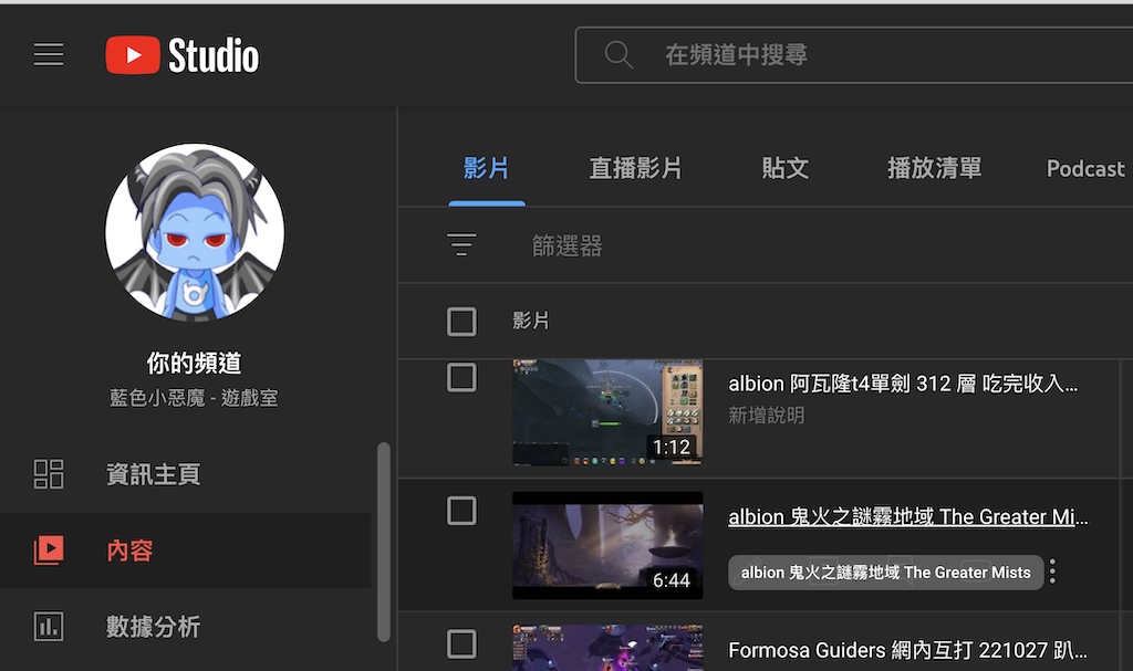 附加檔案 5981_YT工作室-內容.png (266537 bytes) (下載次數: 4028) (YouTube 工作室:內容功能(以前為影片))