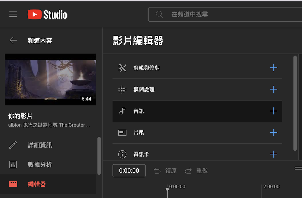 選擇影片後 你會先進入「影片詳細資料」的介面 這時候看左邊功能列會有「編輯器」點擊編輯器進入「影片編輯器」的介面