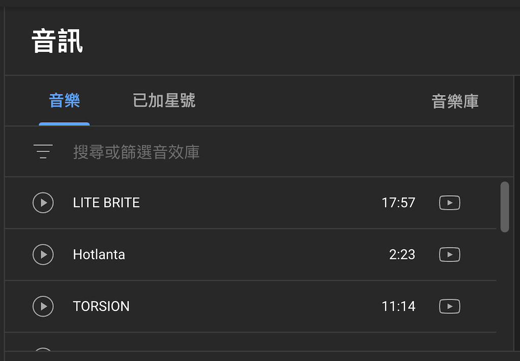 進入「音訊」功能後 YouTube 系統會針對你的影片 列出一些預設推薦的音樂 通常跟你的影片時間長度相依性比較高