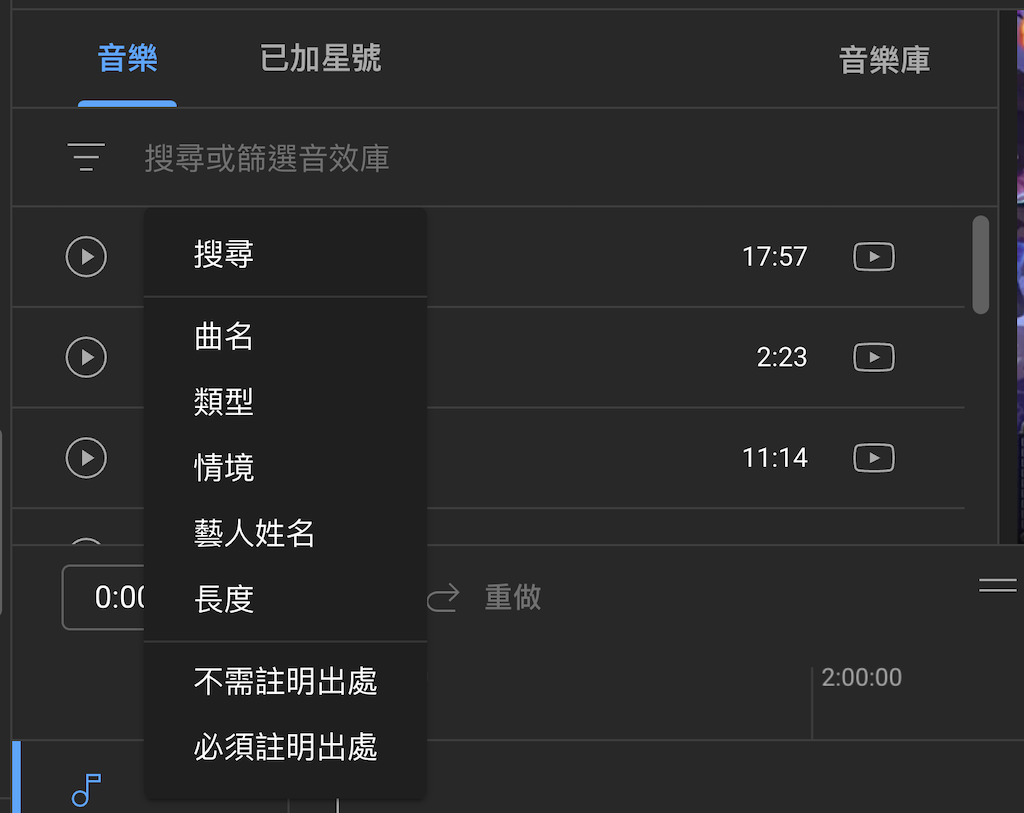 在音訊功能內的篩選項目可以合併使用 通常會混用 類型、情境、長度 較多 接著可以先勾選看看「不需註明出處」如果找不到你喜歡的音樂 那再把「不需註明出處」拿掉...