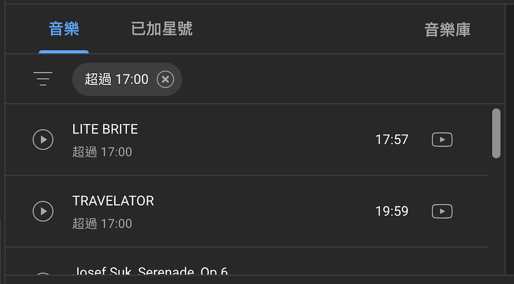 音樂長度篩選預設為「秒」你可以用半形冒號分隔作為{時:分:秒}篩選條件 所以通常會用到分鐘 因此我都會輸入〔超過 xx:00〕來找音樂