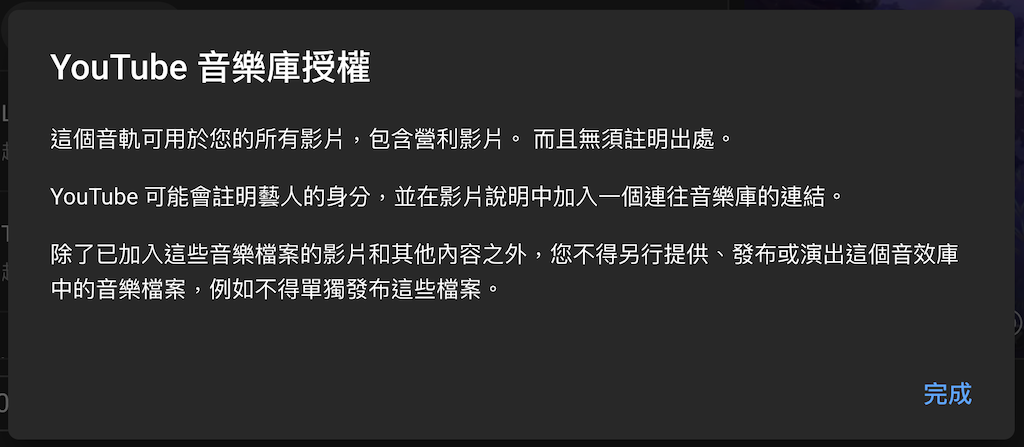 不管你有沒有看到 YouTube 給你這個「音樂庫授權」的警示 強烈建議 你用了 Google 的素材後 就不要把作品拿到別的地方去發布 G老大哪天想改授權內容就改 到時候花時間刪除 TouTube 平台以外的影片是小事 就怕G老大或者音樂原始版權的創作方不知道會搞啥事...