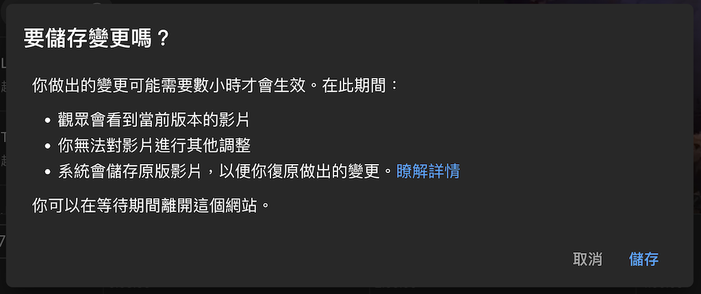 按了【儲存】按鈕後 會提供影片將會處理一段時間 在這期間你的影片仍繼續可以觀看舊版 閱讀完 YouTube 的溫馨提示後 再進行一次:儲存變更 的確認 按一下右下角的【儲存】後 系統就開始處理囉!