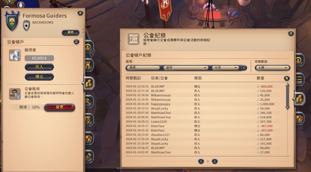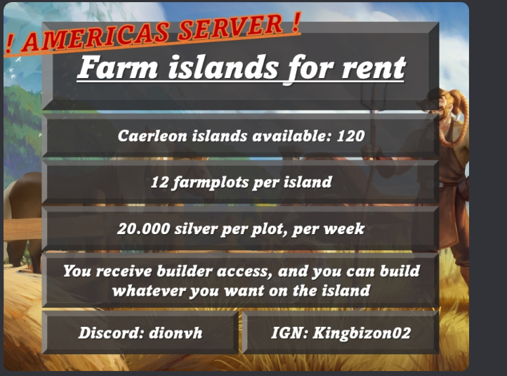 | 阿爾比恩如何輕鬆開始在小島種田賺錢:SRGT新手租島福利!白城農耕小分享有 VIP 的情況下,不澆水只種收小麥,每天一座島純收益約 120k~130k 左右(種植滿等每次澆水僅需消耗 125 專注,一萬專注全澆收益會達至 500k 左右,有食物加乘時賣價會更可觀),每座田含澆水時間大約 15 分鐘(純種菜的時間僅需三分鐘)。前置作業是需要先種蘿蔔升等以及購買第一批小麥種子。實際收益需視當時市場環境而定。 沒有 VIP 種田因為少了收穫加成,加上種子必須回填,所以必虧! Albion 快樂農夫養成公會福利:SRGT 新手租島福利 佃農v3.1 發起人:小菜 <目的> 本著《資源共享 共同成長》的公會宗旨,讓新手每天只需花十五分鐘即可體驗豐盛的農耕生活,從而獲得穩定收入來源(如花費專注點將獲更多收成),節省巨額島嶼升級費用,加快累積遊戲資本。 $無痛v2.1改版(2024-02-04)$ *個人啟動基金「零元」,每座島將由公會鋪滿所需的物資,例如 小麥種子x144 或 藥草x144,符合資格通過審核後直接上島開始賺錢! *新版「無痛零元啟動」優於前版條件,因此取消三天免費使用優惠,但仍有體驗島可申請玩看看,或者用來提升聲望(找會長申請)。 *租用時為「無痛v2.1」版本後的小島(例如:佃農v3.0),歸還小島時必須也鋪好鋪滿所需的物資。 $佃農v3.1改版(2024-09-07)$ 適合現金流吃緊的人、或者想囤貨賣到好價錢的精算仔、或者是三天打魚兩天曬網的摸魚仔,只要一週內隨便有一天還記得去收菜,只要交付該倒的農作物 222 個即可!(v3.1 9/7 由一組降租為 222 個) 另外,如果你是選擇佃農交租版,可以申請「免租福利」的蛋奶小島,數量有限先租先贏! <基本條件> *新訓流程:必須完成新生訓練等級002; *新手優先:白城島租賃總聲望低於 50m 的人優先申請; *>仍要認真練聲望喔!租島後不會因為聲望提升而回收...聲望超過 50m 也可以申請! *前進迷霧:迷霧城島租賃總聲望需大於 50m 的申請人; *資源共享:每人最多只可租賃一座; *>如果有意要多租,必須同意當有其他人申請時可退租一個以外的小島。 <交租方式> *租期租金:以下三種方法任選一種即可 *>銀幣 - 每七天為一個單位,五萬銀幣自存公會; *>拉球 - 每週協助拉一個能量球餵 KL, SW, FB 小地堡; *>佃農 - 每週交所租小島種植的農作物 222 個。 *存取紀錄: *>銀幣 - 銀幣在遊戲裡所有人都可以查詢存取紀錄,但系統只會保存四個禮拜,怕會忘記的人要另做記錄; *>拉球 - 能量球遊戲中沒有紀錄可查,可在「地堡能量及餵食日誌」留言即可; *>佃農 - 指定的交租箱子也有四個禮拜的紀錄可查看。 *交租日期:請固定於每週六交租,以便幹部查核; *良心交租:沒有安排幹部專程去查核,但還是希望承租的人自己記得交租,畢竟誠信是很重要的! *申請方法:請於DC與小菜或會長聯絡。 <小島列表> . <自立門戶>租島的夥伴們,賺到的錢要投資到自己的小島上喔!先把自己第一個島買起來,然後至少盡快升級到 vl2,相信在公會的租島優惠下,即使你是真的身無分文,也能在一個禮拜後把買到自己的小島並且升級到二級! 個人島嶼成本降低,您購買的第一個島嶼或第一次將任一島嶼升級到某個特定等級時所需的銀幣都變少了,如下 等級1:20,000 等級2:500,000 等級3:1,125,000 等級4:1,312,500 等級5:1,500,000 等級6:2,000,000 第二座開始的島嶼購買價格詳見《阿爾比恩狂野之血改版前必做的事:公會島升級!》 基本的阿爾比恩農業系統教學請看官網《教學:農業系統》 底下是小惡魔 albion 的推薦連結 如果你還沒註冊帳號 請考慮使用我的推薦 謝謝! https://albiononline.com/?ref=YTB5XSL94Y 如果你在尋找 albion 國際服 中文公會 請參觀我們 [SRGT]Formosa Guiders 的 Discord 伺服器 https://discord.gg/yUqTT7yAyu 最後提供 2024年九月 北美伺服器有個玩家農夫出租的廣告給大家當作行情參考 粉專相簿:公會福利 v3.1.0046 ----------------------------------------  公會銀幣庫存取紀錄.jpg
