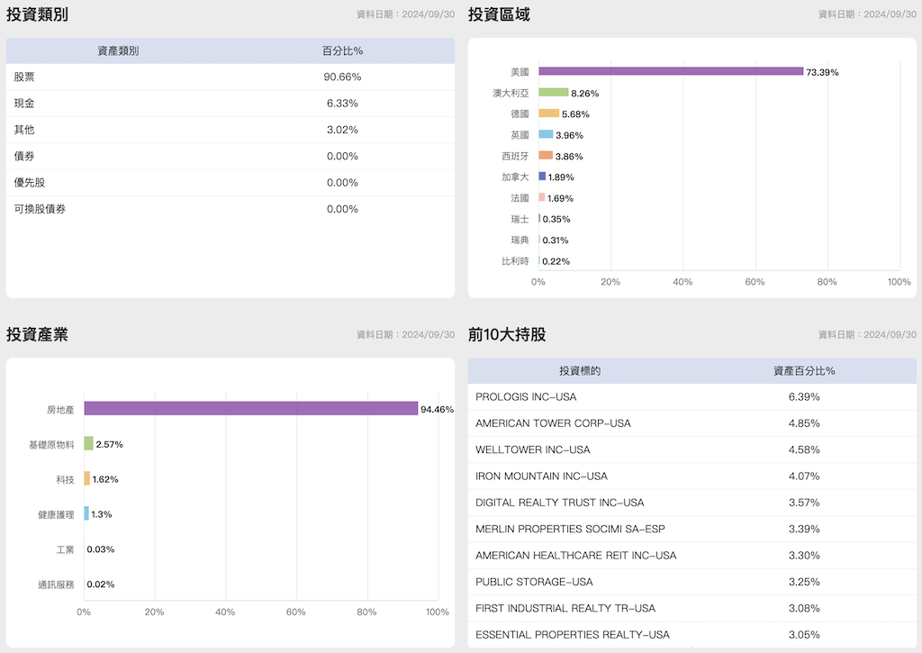 2024-11-14:年化標準差 9.87%、Sharpe 0.52、Beta 0.48(三年定期定額報酬率 14.34%、年化 4.57%)