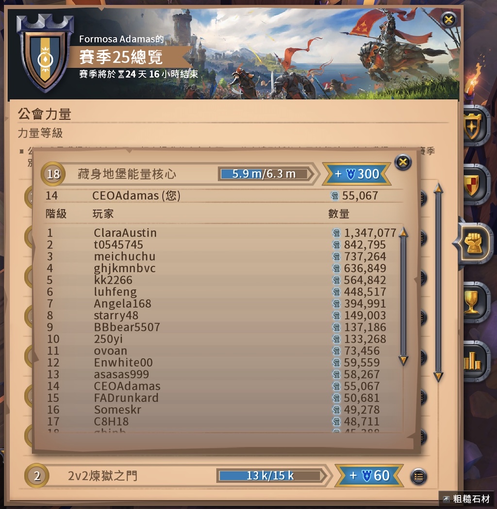 1. 只要當季拉球分數達到 500k 以上即可截圖私訊會長申請(小號在小地堡的分數加倍計算!)