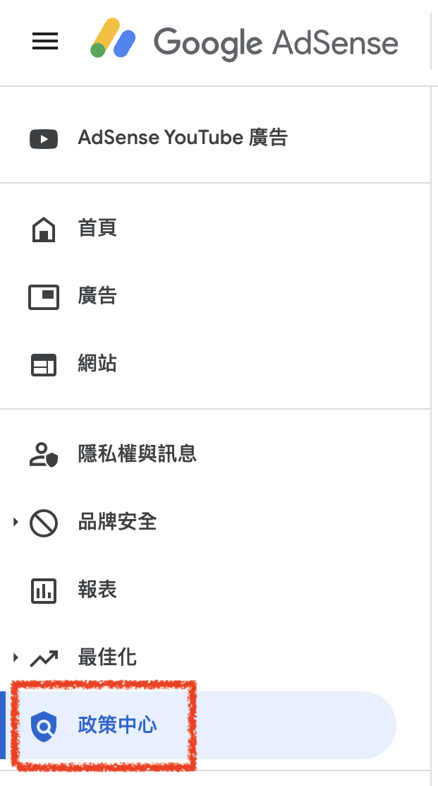 登入自己的 Google AdSense 後點擊左邊功能選單的「政策中心」