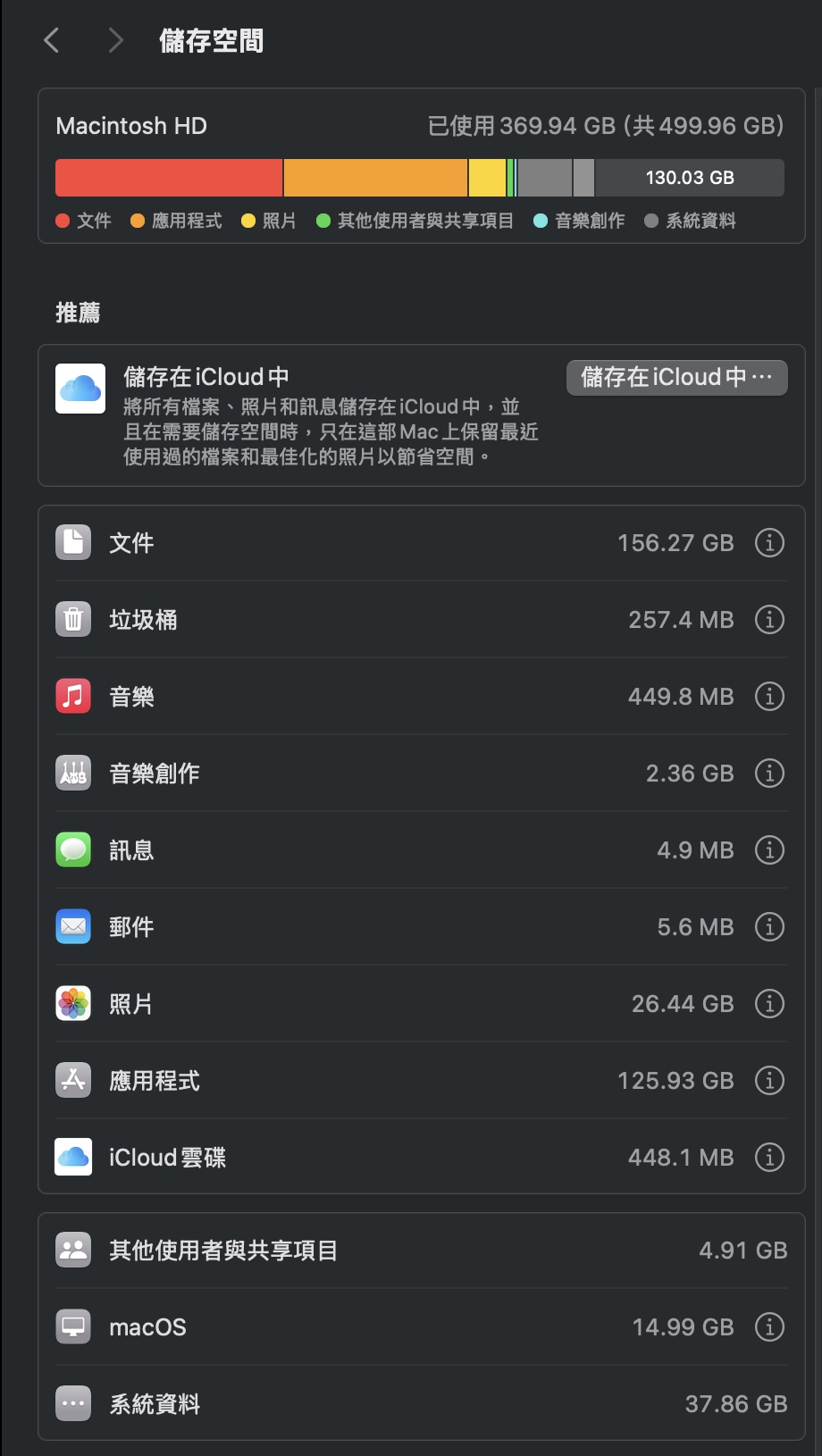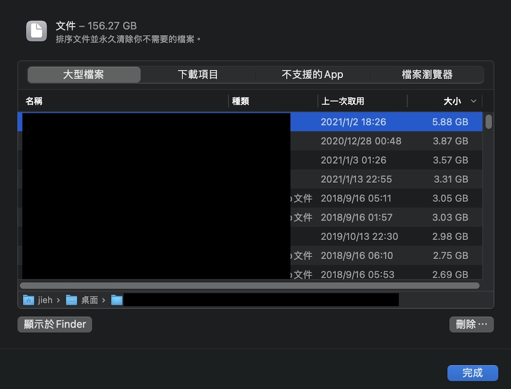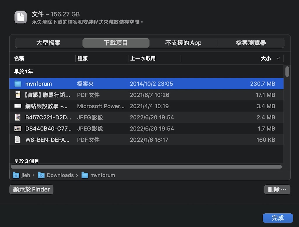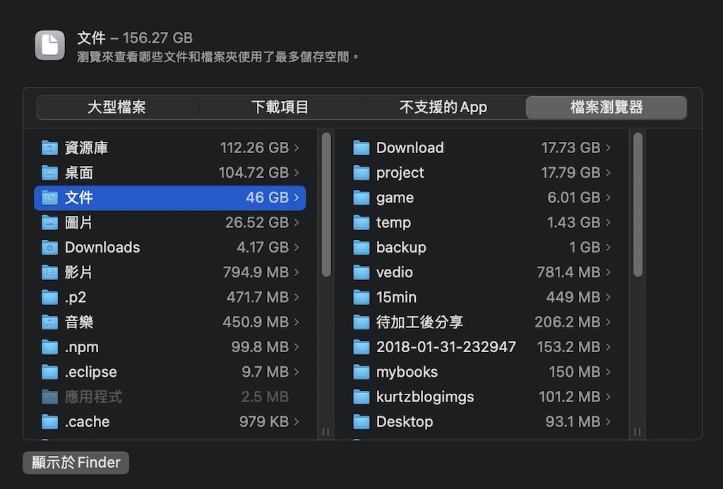 MacOS 如何有效率地管理、檢視和清理儲存空間原則上我也是建議買 Mac 系列設備內建硬碟不要花錢買太大 因為出廠升級可能比金子還貴... 外接硬碟或行動儲存媒體會是很好的選擇 想省去插拔的麻煩就買個 SD 卡 輕便一點 CP值高的話就用隨身碟 盡可能把內建硬碟儲存空間省下來處理進行中的工作 其他不常用但是偶爾需要參考或保存的檔案 就經常整理到外接儲存媒體上 那如果已經使用上一陣子才發現需要整理的話 如何在最短時間清出空間先讓工作能進行呢? 底下就分享 macOS 內建的功能 讓你快速整理 Mac 儲存空間 一、設定:打開「設定」「一般」然後選擇〔儲存空間〕 二、儲存空間:進入 儲存空間 後 會列出每個大分類所佔用的儲存空間 每個類別的處理功能選項不同 例如「垃圾桶」會有一個〔清空垃圾桶〕的功能 按下去就直接沒了... 不過大部分的人除了直接清空垃圾桶之外 可能還需要打開〔文件〕(點一下右邊的"i")進入下一步 三、文件:打開這個介面有四個選擇 大型檔案、下載項目、不支援的App、檔案瀏覽器 如果運氣好的話在 〔大型檔案〕 這裡面就能清出夠用的空間 四、刪除:如果確定是不需要的檔案 點選檔案後按下【刪除⋯】就會直接掰了!!!垃圾桶也找不到喔... 所以要想清楚才從這裡按【刪除⋯】 五、下載項目:接下來雖然 下載項目 也很值得去檢視 建議稍微處理一下就好 真的要清還是打開 Finder 去整理 萬一不小心刪錯 還有一條命可以用:垃圾桶還原! 六、檔案瀏覽器: 整理 下載項目 還不過癮的話 打開〔檔案瀏覽器〕可以一次看清楚到底在哪些資料夾下還佔用很多空間 進入這個功能建議去上個洗手間再回來 先讓系統統計一下 特別是你第一次或已經很久沒使用這功能的話 ---------------------------------------- ---------------------------------------- ---------------------------------------- ---------------------------------------- ---------------------------------------- ---------------------------------------- ---------------------------------------- ---------------------------------------- 支持小惡魔 BTC : 19tn3RnCuwZVukXAwyhDWZD4uBgUZoGJPx LTC : LTFa17pSvvoe3aU5jbmfcmEpo1xuGa9XeA 知識跟八卦一樣,越多人知道越有價值;知識最好的備份方法,散播! 藍色小惡魔(林永傑): 臉書 ---------------------------------------- [編輯文章 25 次, 最後修改: jieh 於 2025/5/23 下午 09:09:02] |
