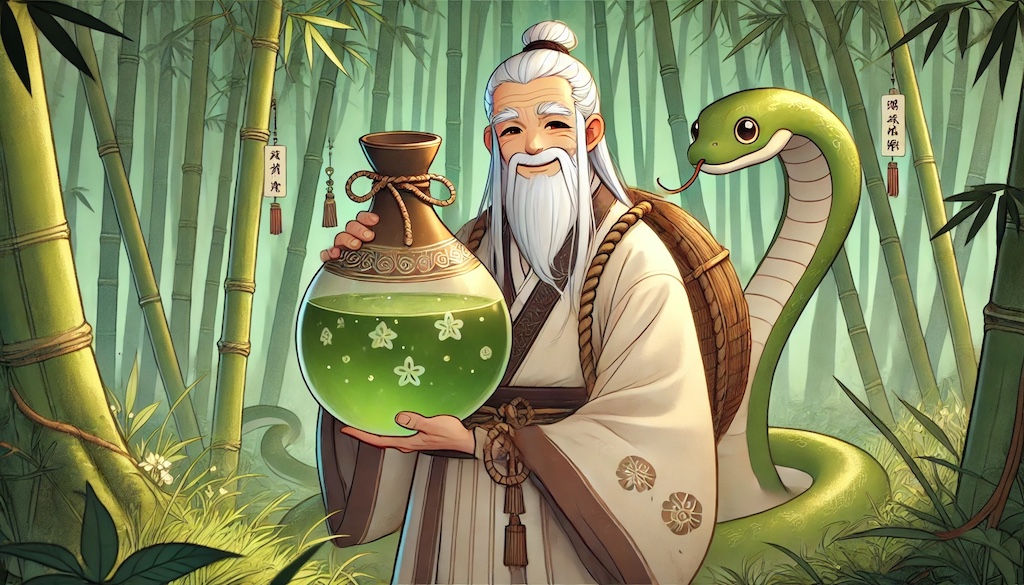 這日,有個遊方的小道士途經此處,也想瞧瞧夜集的熱鬧,便跟著鄉民秉燭夜遊。起先他逛得很盡興,直至到了那賣油翁的攤前,一股綠氣蕩蕩悠悠,自他的身上飄散而出。那小道士知他是個妖怪,隨即念起靈官咒驅邪消災,那賣油翁不消掙扎,迅速現出原形,乃是個綠皮大青蛙。