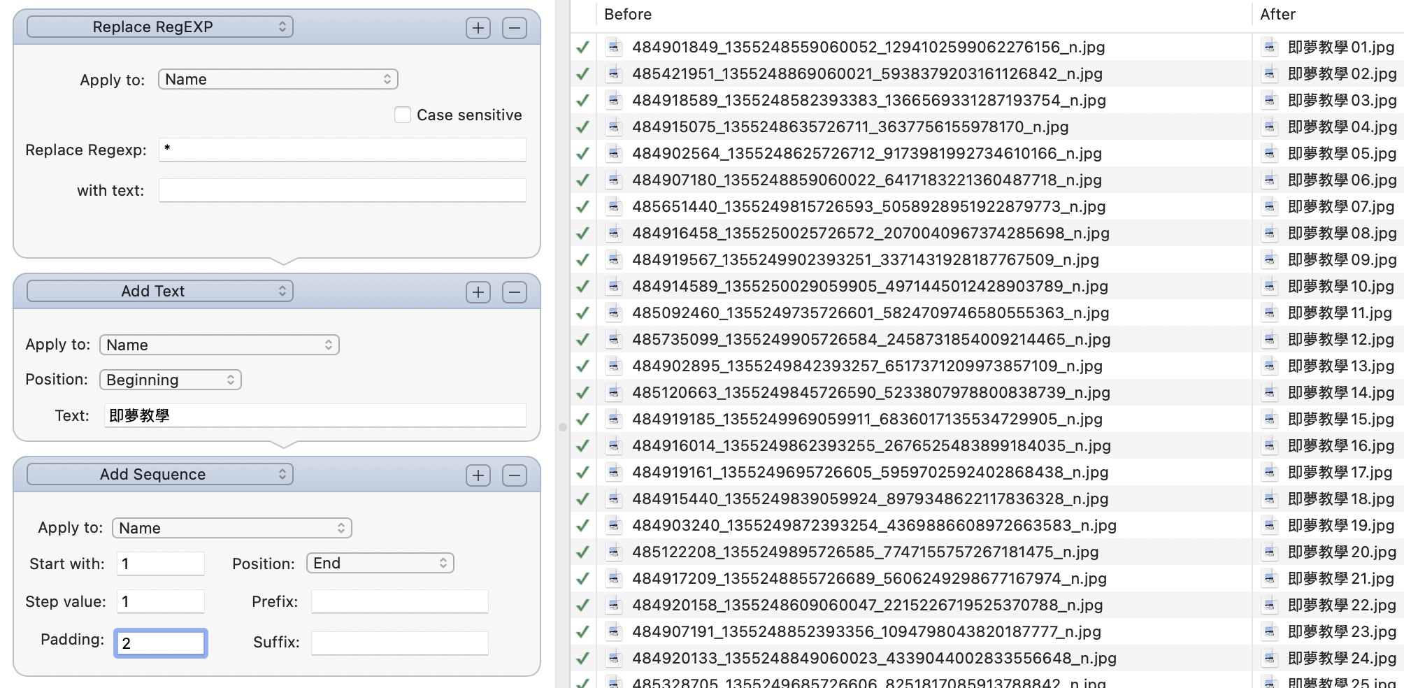 使用 macOS 免費軟體 ForkLift 批次變更檔案名稱範例因為這批檔案名稱沒有規律 所以用下載的時間作為排序後 進行名稱變更 所以原來的檔案名稱都不要 所以多了一個步驟:洗掉所有檔名 把要變更的所有檔案選取起來後 從選單點選批次變更檔名的功能:File/Multi Rename 因為副檔名保留原味 所以要先將〖Apply to 〗改為:Name 1. 選〔Replace RegEXP〕洗掉所有名字 2. 在最前面加上我要的檔案名稱〔Add Text〕加選:Position = Beginning 然後填上我要的前綴檔名 3. 加上流水號 接在檔名後面(Position = End)從 1 開始(Start with = 1)數字遞增 1 即可(Step value = 1)補滿兩位數(Padding = 2) 4. 從預覽的 After 確認結果是想要的 那就按下【Rename】 ---------------------------------------- ---------------------------------------- 支持小惡魔 BTC : 19tn3RnCuwZVukXAwyhDWZD4uBgUZoGJPx LTC : LTFa17pSvvoe3aU5jbmfcmEpo1xuGa9XeA 知識跟八卦一樣,越多人知道越有價值;知識最好的備份方法,散播! 藍色小惡魔(林永傑): 臉書 ---------------------------------------- [編輯文章 5 次, 最後修改: jieh 於 2025/5/29 下午 07:29:40] |