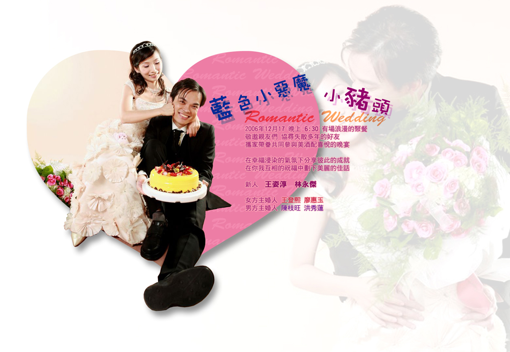 電子喜帖出爐 一切盡在不言中 請欣賞附檔吧~~~原汁原味 感謝我老婆的小舅舅 為我們精心設計這張電子喜帖 巧心讓喜帖還能當桌布 為了讓各位能夠欣賞到一刀未剪的原作 可能開圖的時候有點慢喔~~~ 請大家耐心等候 ![]() ---------------------------------------- ---------------------------------------- 支持小惡魔 BTC : 19tn3RnCuwZVukXAwyhDWZD4uBgUZoGJPx LTC : LTFa17pSvvoe3aU5jbmfcmEpo1xuGa9XeA 知識跟八卦一樣,越多人知道越有價值;知識最好的備份方法,散播! 藍色小惡魔(林永傑): 臉書 ---------------------------------------- [編輯文章 1 次, 最後修改: jieh 於 2006/12/3 下午 05:11:04] |